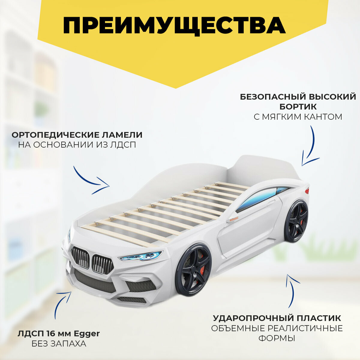 Ниже Вы можете прочитать отзывы на Кровать-машина детская Romeo белая, Romack, спальное место 70х170, с подсветкой фар, ортопедическим основанием, эко матрасом, ознакомится с подробными характеристиками, посмотреть интересные обзоры и фотографии на Кровать-машина детская Romeo белая, Romack, спальное место 70х170, с подсветкой фар, ортопедическим основанием, эко матрасом.