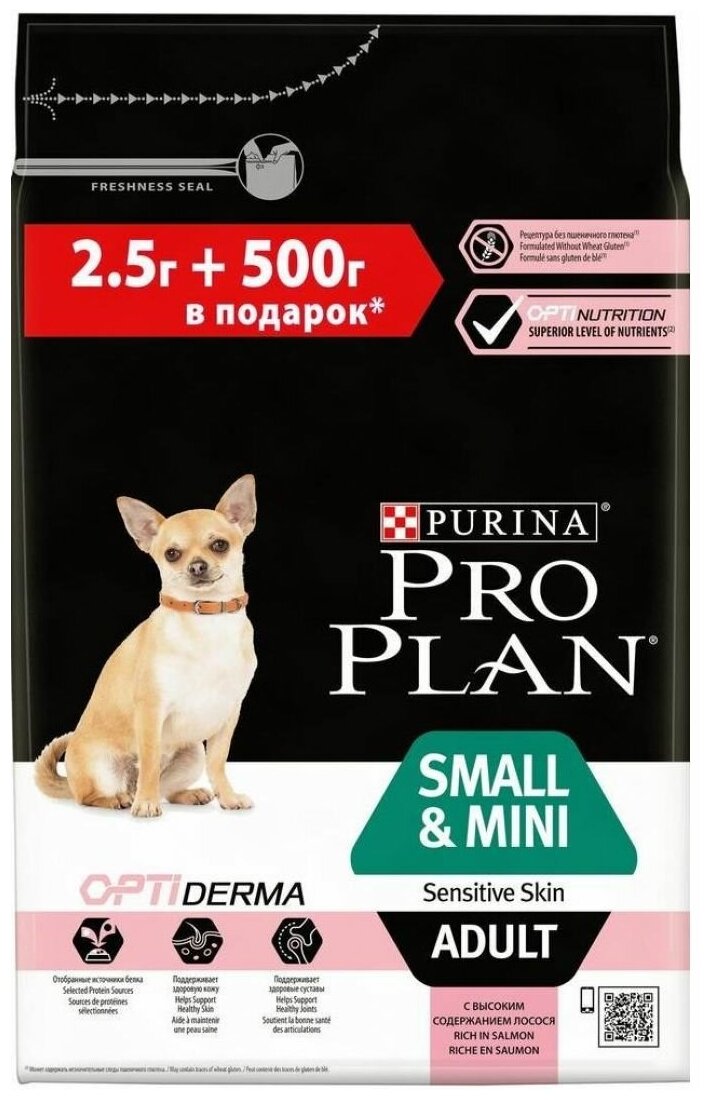 Purina PRO PLAN промо Сухой корм Pro Plan для взрослых собак мелких и карликовых пород с чувствительной кожей, с высоким содержанием лосося 2,5кг+500 г