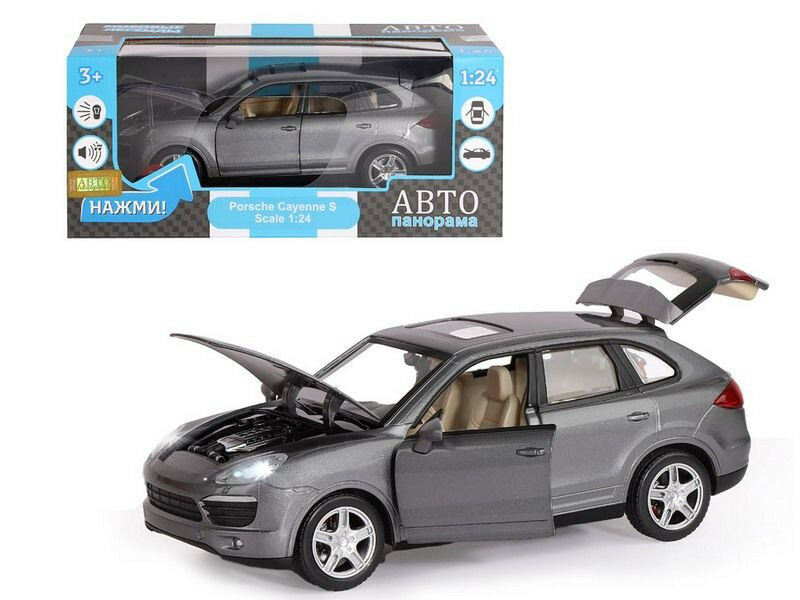 Модель машины Автопанорама 1:24 Porsche Cayenne S, серый, свободный ход колес, открываются двери, капот и багажник, свет, звук