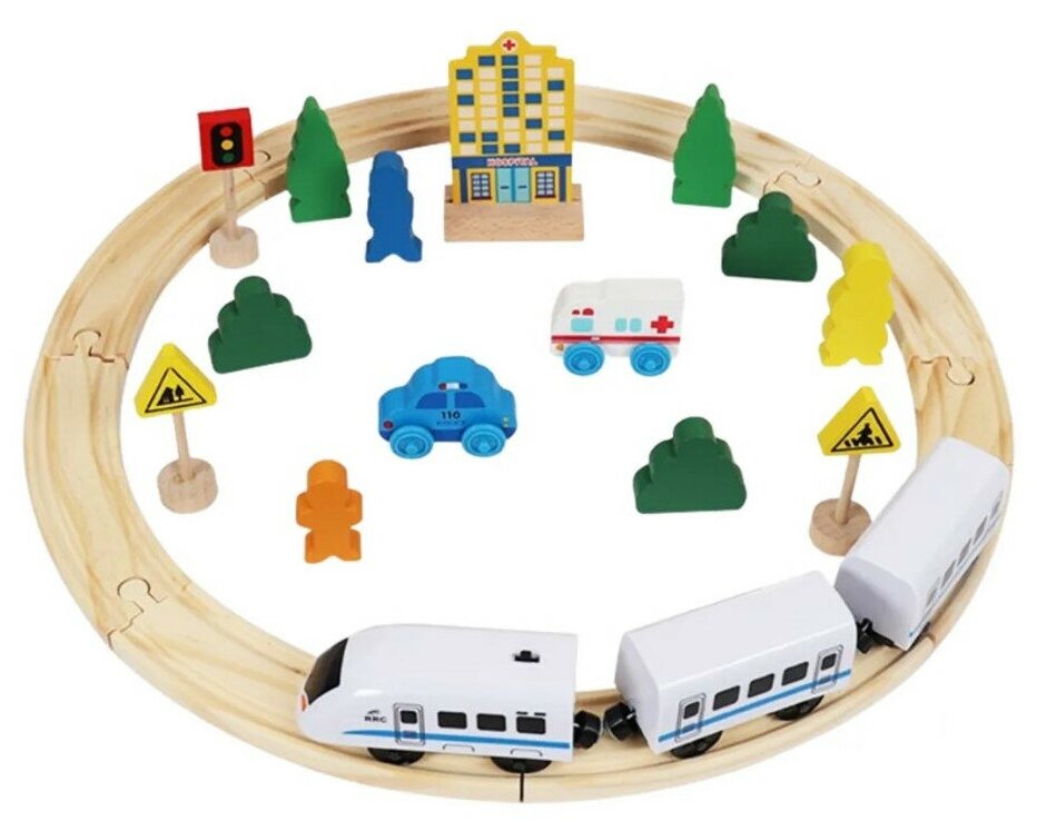 Купить Деревянная железная дорога 26 деталей с поездом на батарейках, развивающая игрушка для детей от 3-х лет, деревянный конструктор для мальчиков