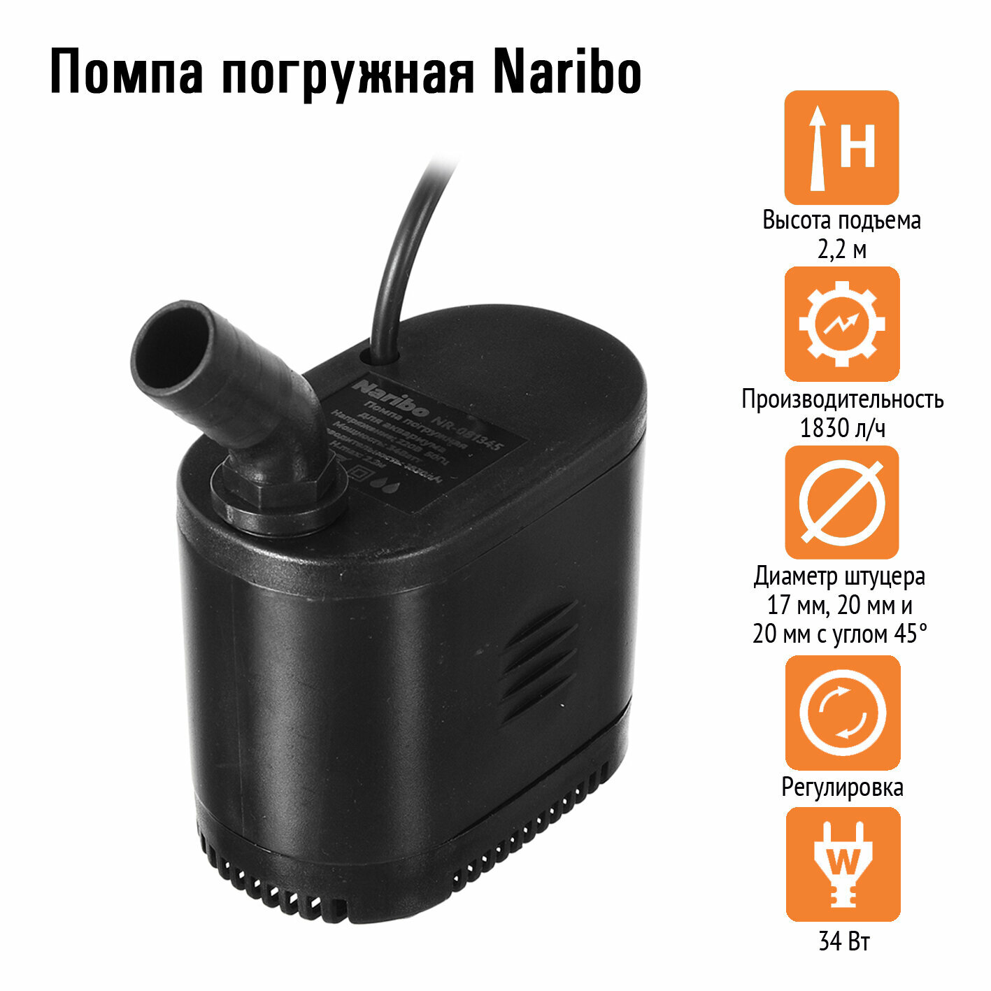 Naribo Помпа погружная Naribo 34 Вт, 1830 л/ч, h.max 2,2 м