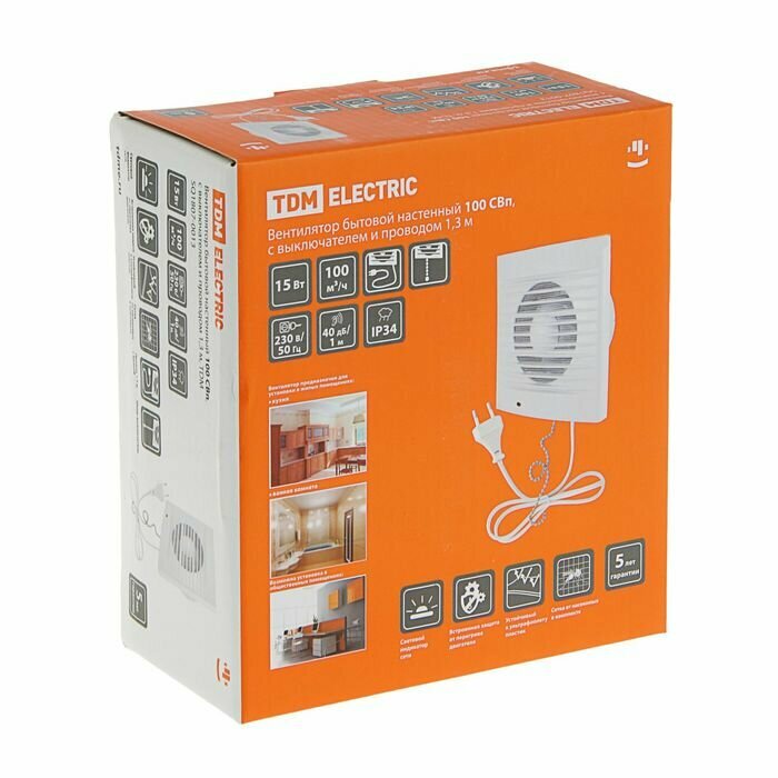Вентилятор бытовой настенный 100 СВп, с выключателем и проводом 1,3 м, TDM SQ1807-0013