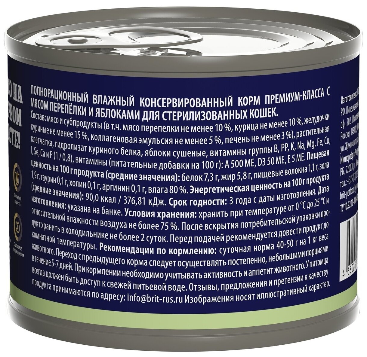 Корм для кошек BRIT Premium by Nature для стерилизованных, мясо перепёлки с яблоками банка 200г