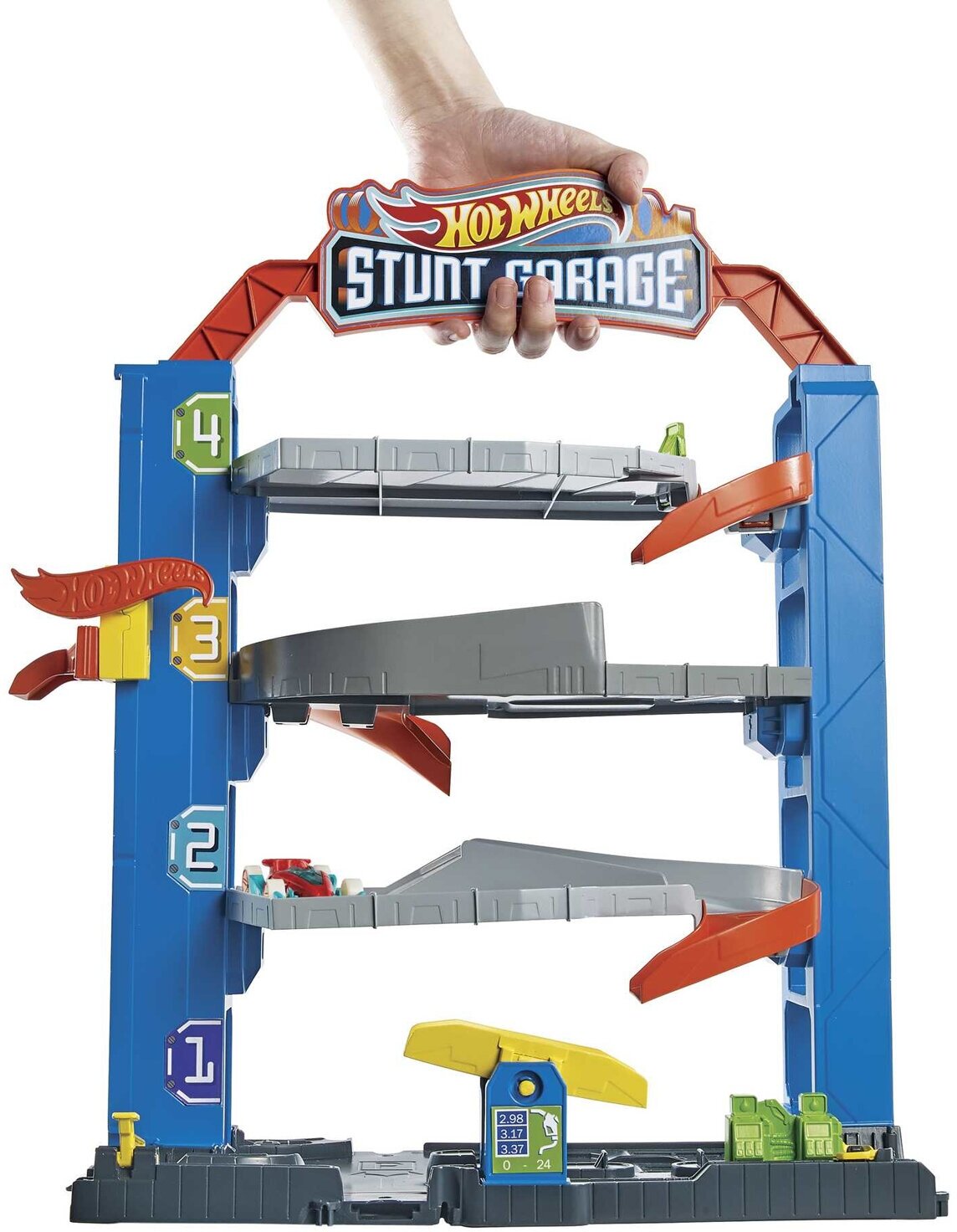 Игровой набор Hot Wheels City Гараж 3х уровня для трюков, в наборе с 1 машинкой, масштаб 1:64, GNL70, голубой/оранжевый/серый