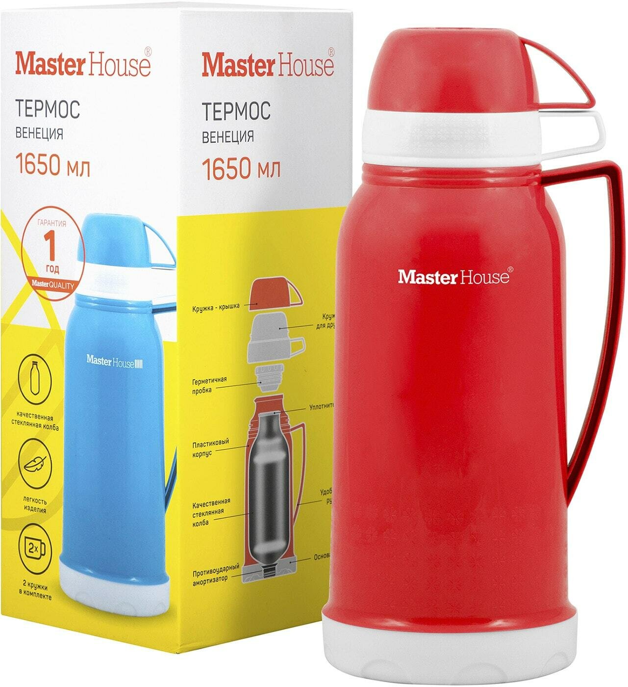 Термос Венеция стекл. колба/пластик узкое горло, 1,65л, чашки 2шт, красный, 60331/60503 Master House (арт. 613627)