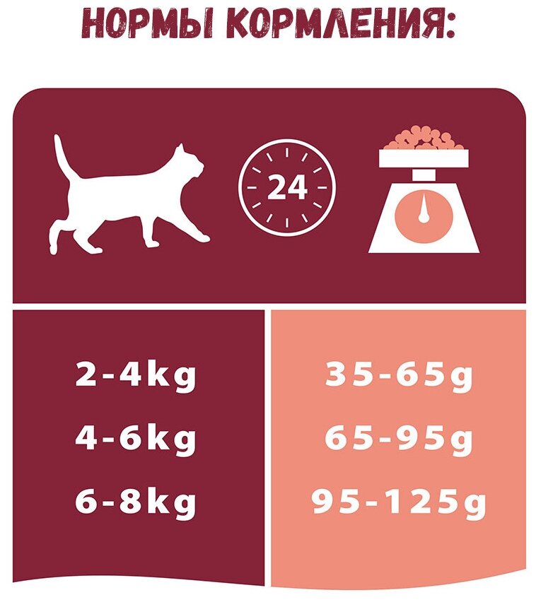 | Дозировка | см. таблицу. Рекомендации по кормлению, позволяющие поддерживать идеальную форму, могут варьироваться в зависимости от возраста животного, его активности и условий окружающей среды. Следите за весом Вашей кошки и корректируйте количество даваемого корма. Изменение количества корма должно осуществляться постепенно. Повторно оцените вес вашей кошки и состояние ее организма через несколько недель с начала кормления. Кошки, страдающие ожирением, должны быть обследованы ветеринарным врачом, который контролирует программу по снижению веса. Следите, чтобы у Вашей кошки всегда была чистая свежая питьевая вода. Для здоровья Вашей кошки регулярно консультируйтесь с ветеринарным врачом. |