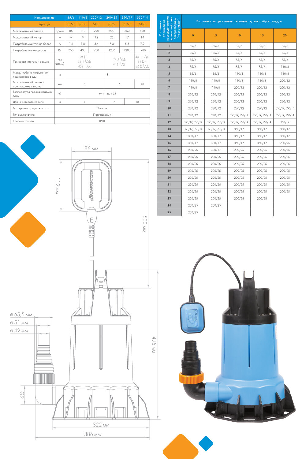 | Дополнительная информация | рекомендовано не более 20 включений в час, запрещается погружать, вытаскивать или переносить насос за кабель, максимальный расход: 200 л/мин, степень защиты: x8, максимальное давление: 2.5 бар |