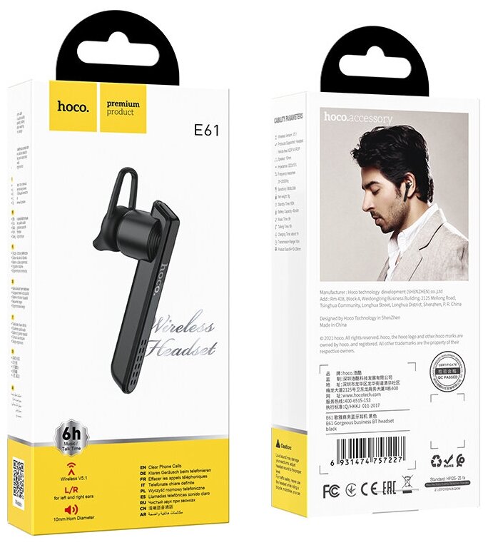 BT гарнитура Hoco, E61 (универсальная для всех телефонов), черный