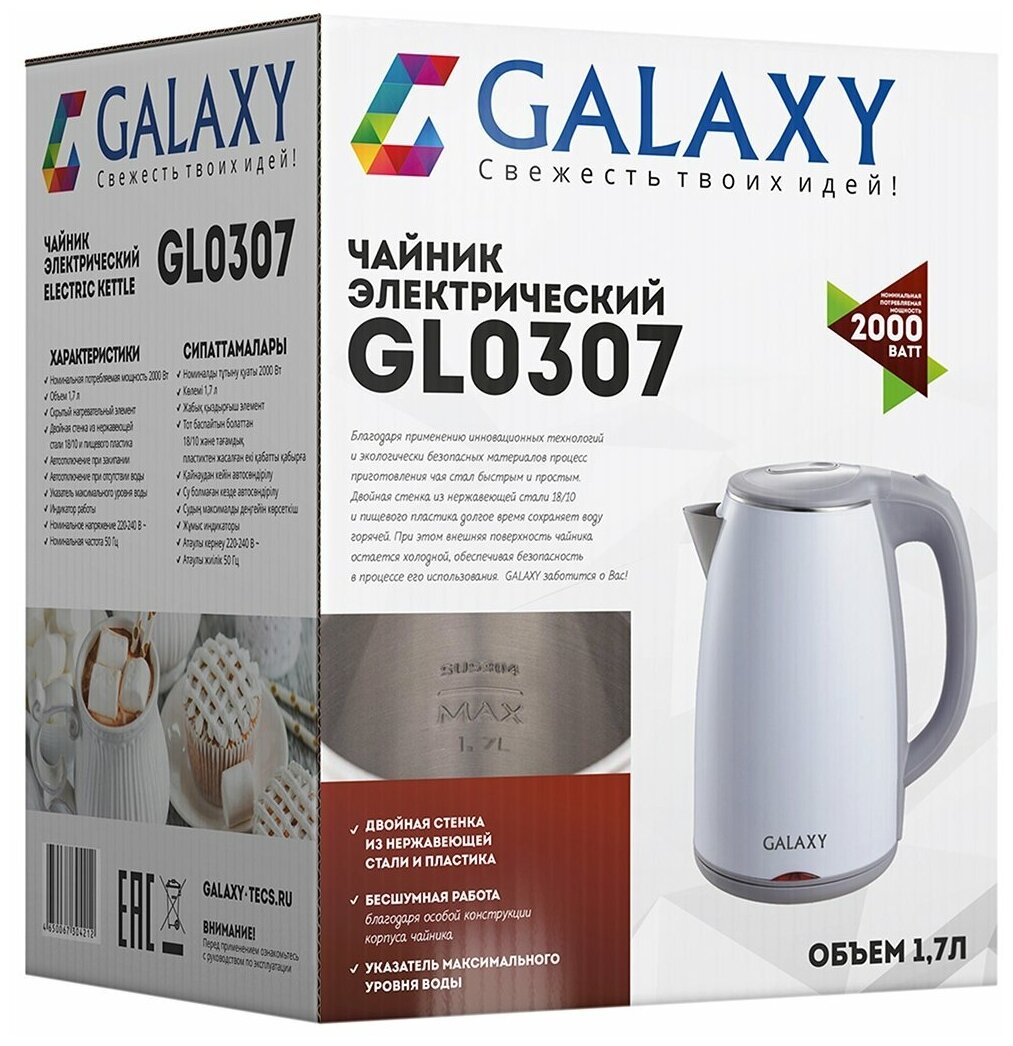 Чайник электрический Galaxy GL 0307, металл, 1.7 л, 2000 Вт, белый интересное: