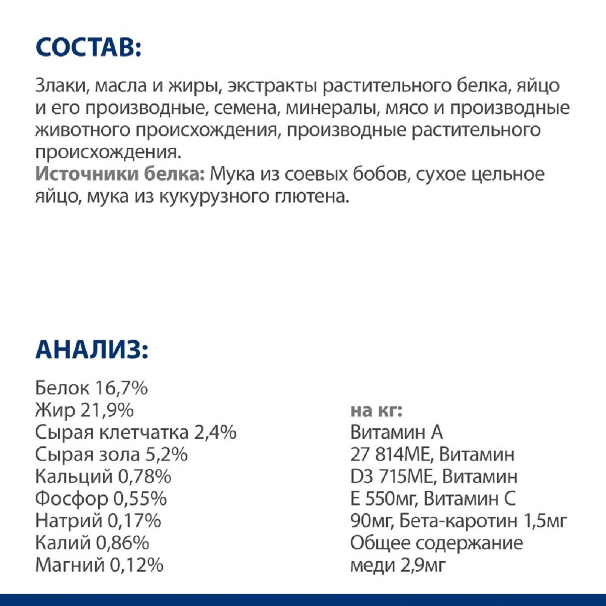 | Витамины | на кг: витамин А 10 904 МЕ, витамин D3 758 МЕ, витамин E 690 мг, витамин С 105 мг, бета-каротин 1,5 мг; с натуральным антиоксидантом |