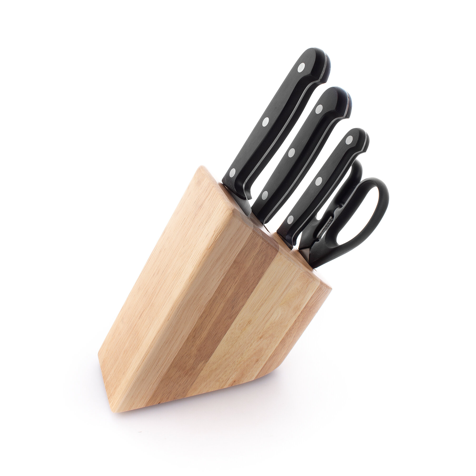 | Комплектация | -нож для чистки овощей 10 см; -нож поварской 15 см; -нож поварской 17 см; -ножницы разъемные 19 см; -подставка для ножей. |