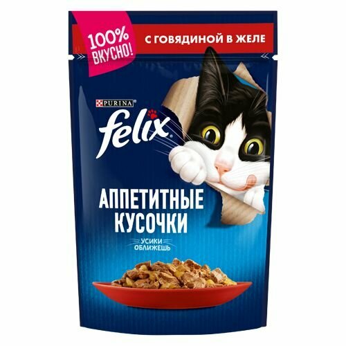 Felix Аппетитные кусочки полнорационный влажный корм для кошек, с говядиной, кусочки в желе, в паучах - 75 г х 26 шт