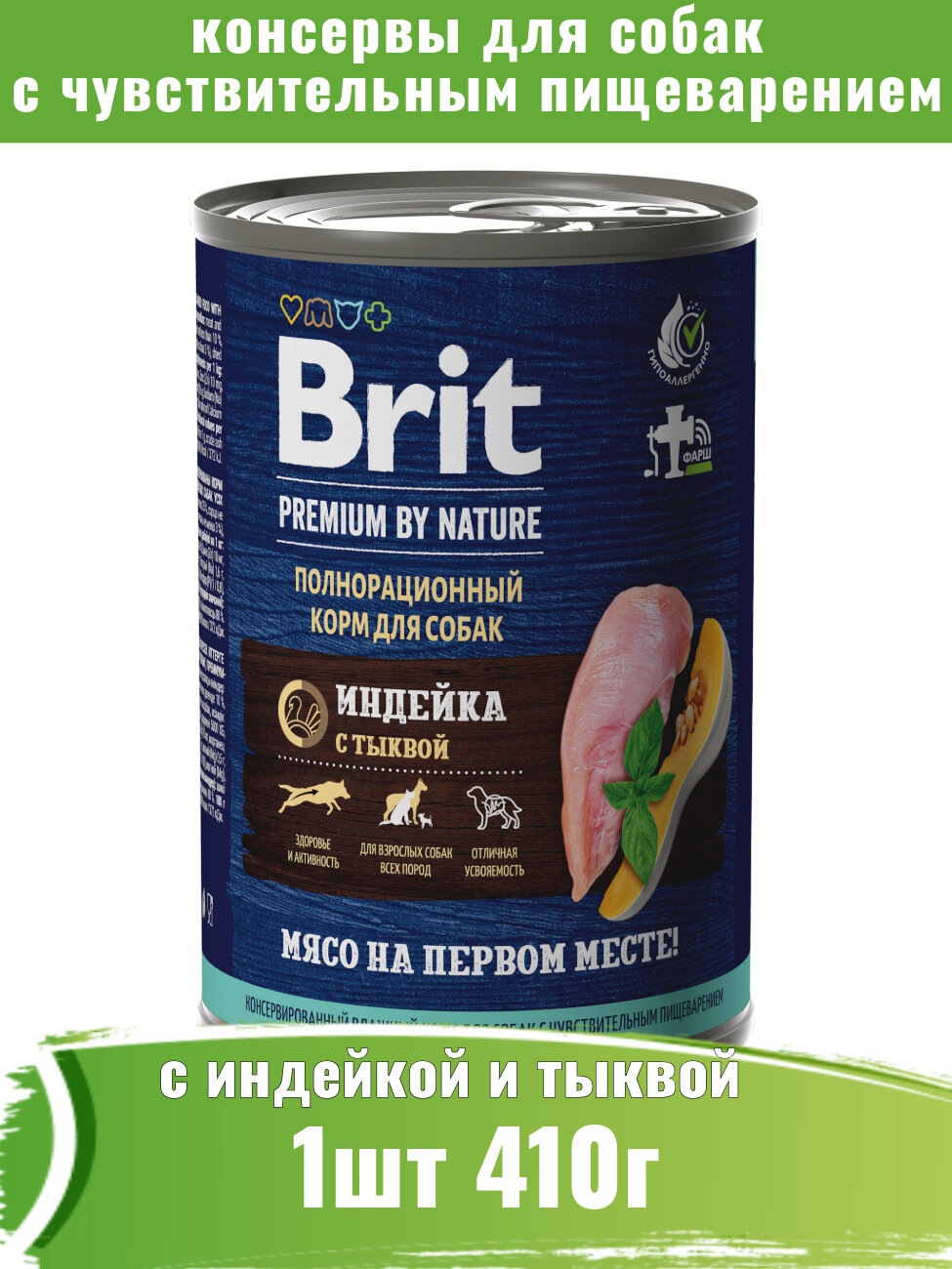 BRIT PREMIUM BY NATURE DOG для взр собак всех пор с чувств пищ с индейкой и тыквой банка 410 гр 410 гр х 6 шт
