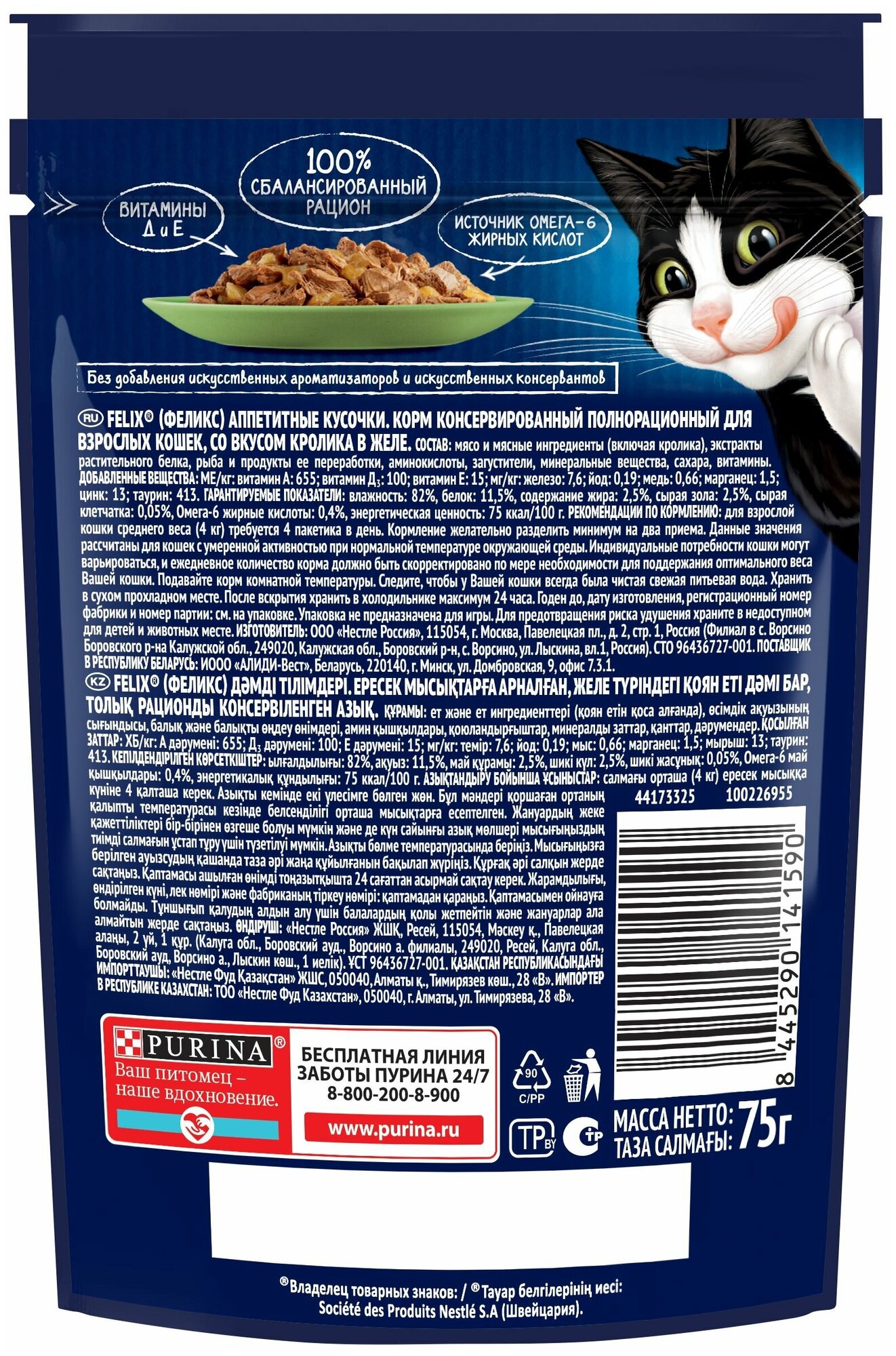 Влажный корм для взрослых кошек Felix Аппетитные кусочки кролик в желе 26шт.*75г