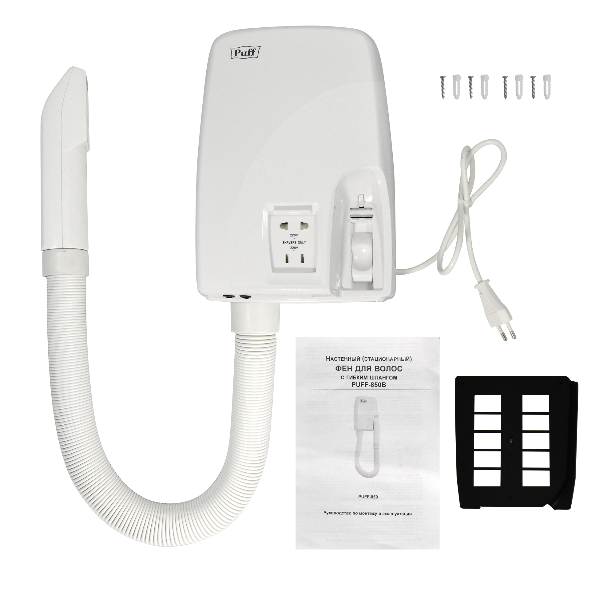 Фен для волос и тела настенный с держателем, белый мощность 850 Вт., С электрозеткой Puff-850В Арт:1405.021