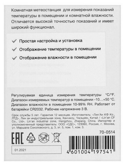 | Дополнительная информация | точность температуры: ± 1 ℃; точность влажности: ±5% (40% ~ 80%), другие ± 8%; рабочее напряжение: 3 В постоянного тока |
