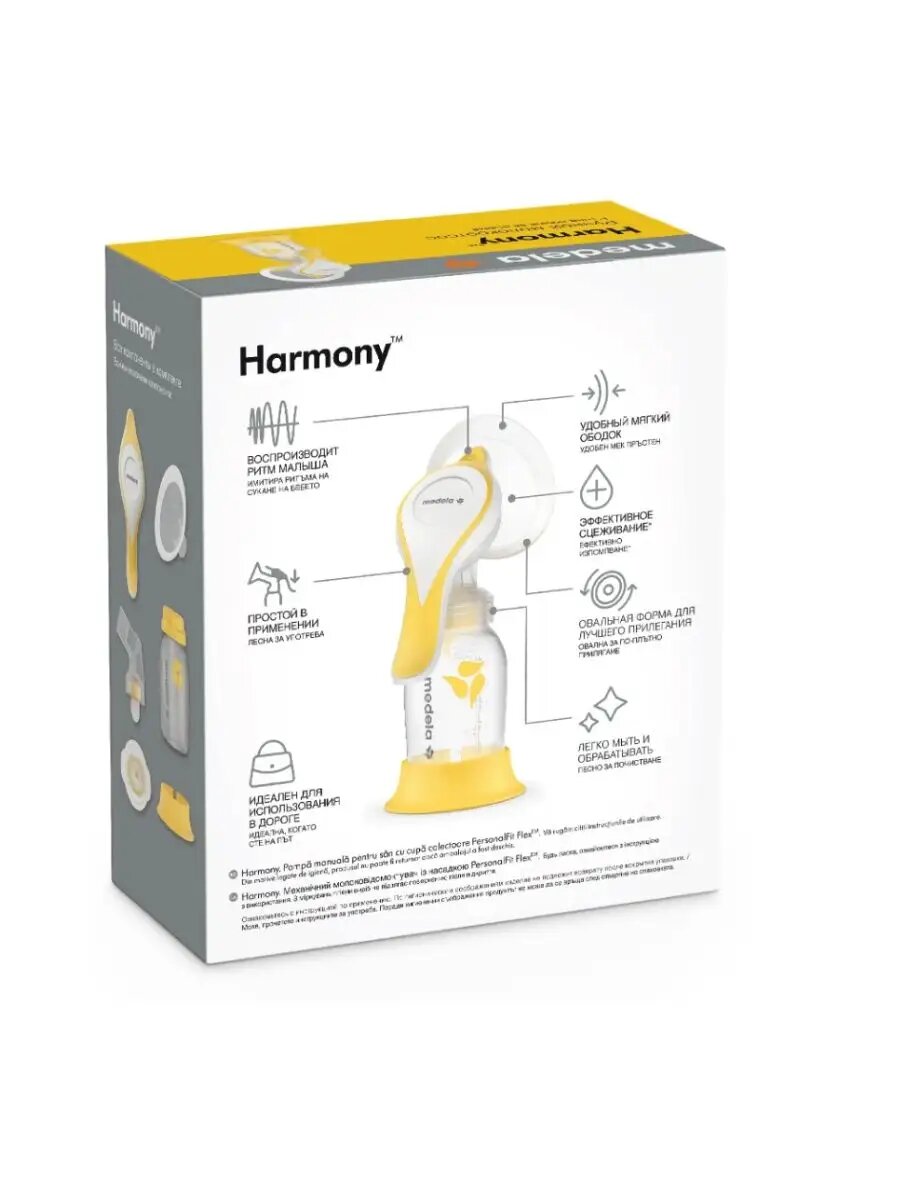 | Подробная комплектация | 1 ручной молокоотсос Harmony с воронкой PersonalFit Flex (размер М) и бутылочкой емкостью 150 мл, 1 силиконовая соска (размер S, медленный поток) с колпачком |