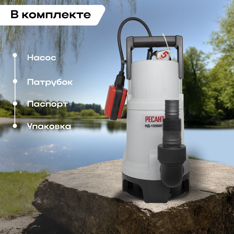 Насос дренажный погружной РЕСАНТА НД-15500П/35 для грязной воды (258 л/мин, с поплавковым выключателем) для откачки воды из водоемов, шахт, подвалов, помещений, бассейнов / для дома и дачи