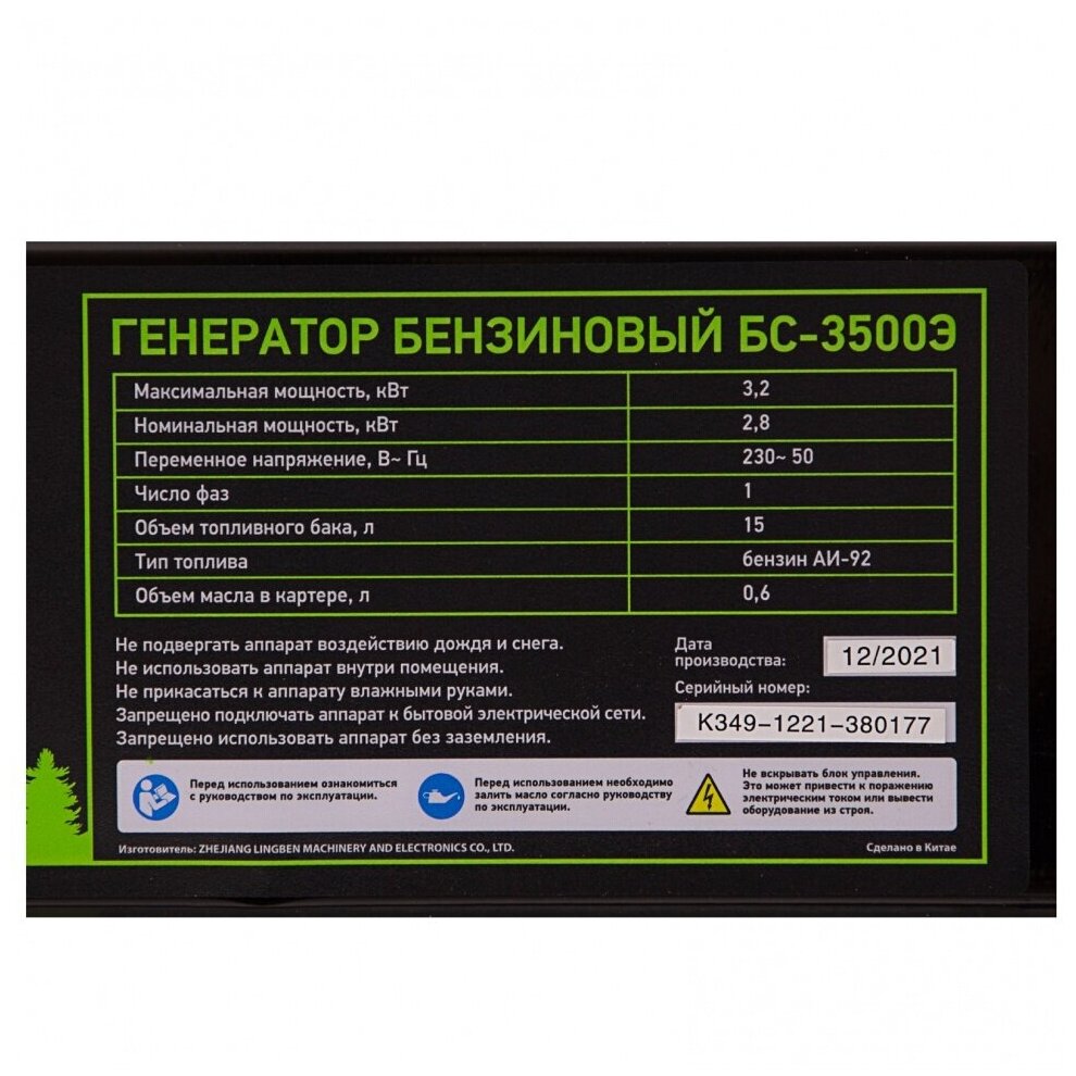 Генератор бензиновый БС-3500Э, 3,2 кВт, 230В, 15 л, электростартер// Сибртех, арт. 94538
