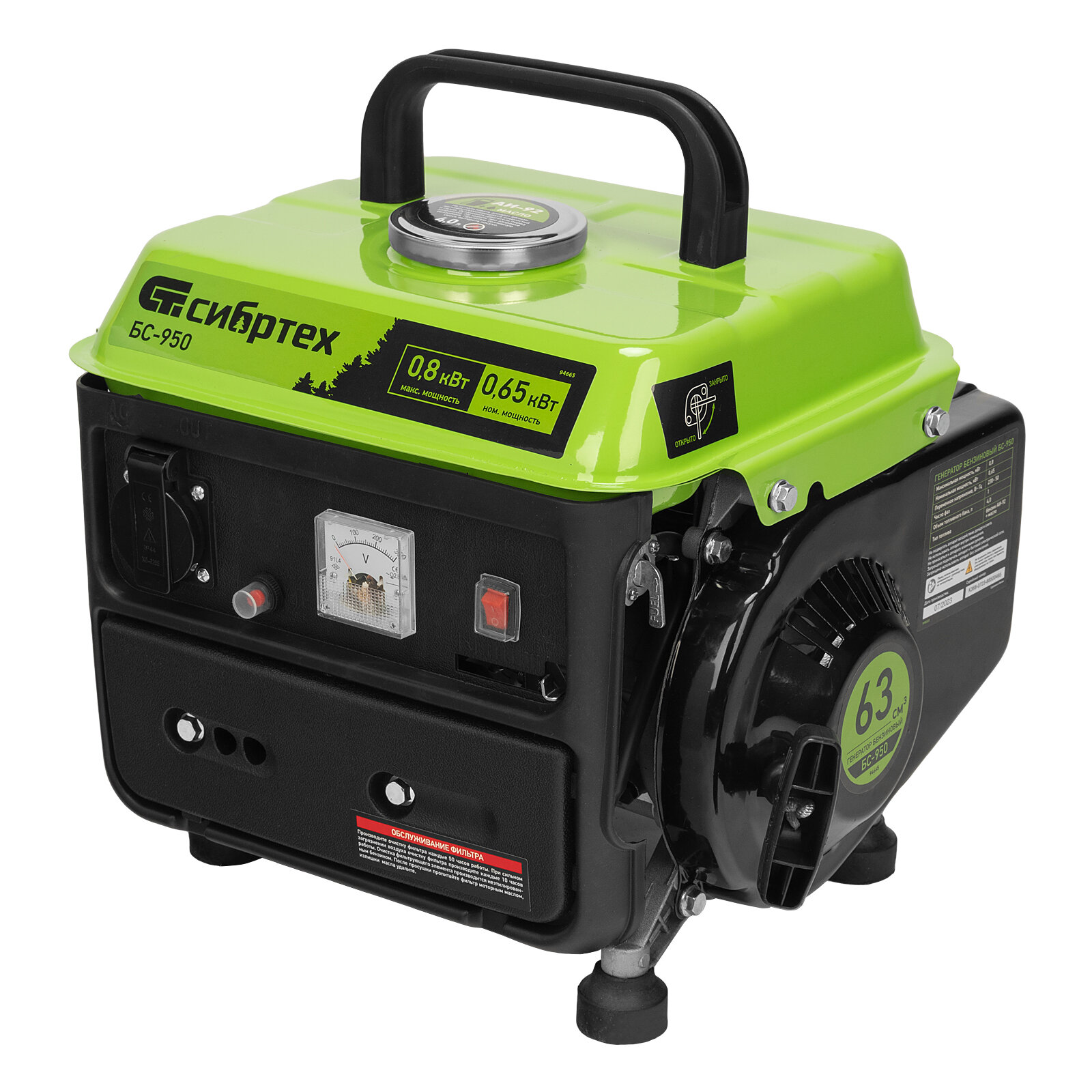 Генератор бензиновый БС-950, 0,8 кВт, 230 В, 2-х тактный, 4 л СИБРТЕХ 94665