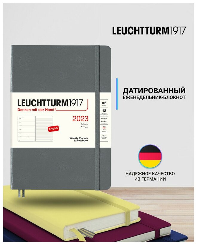 Купить Еженедельник-блокнот Leuchtturm1917 Medium A5 (14.5x21см.) датированный на 2023 год, 80г/м2 - 144стр., мягкая обложка, цвет: антрацитовый