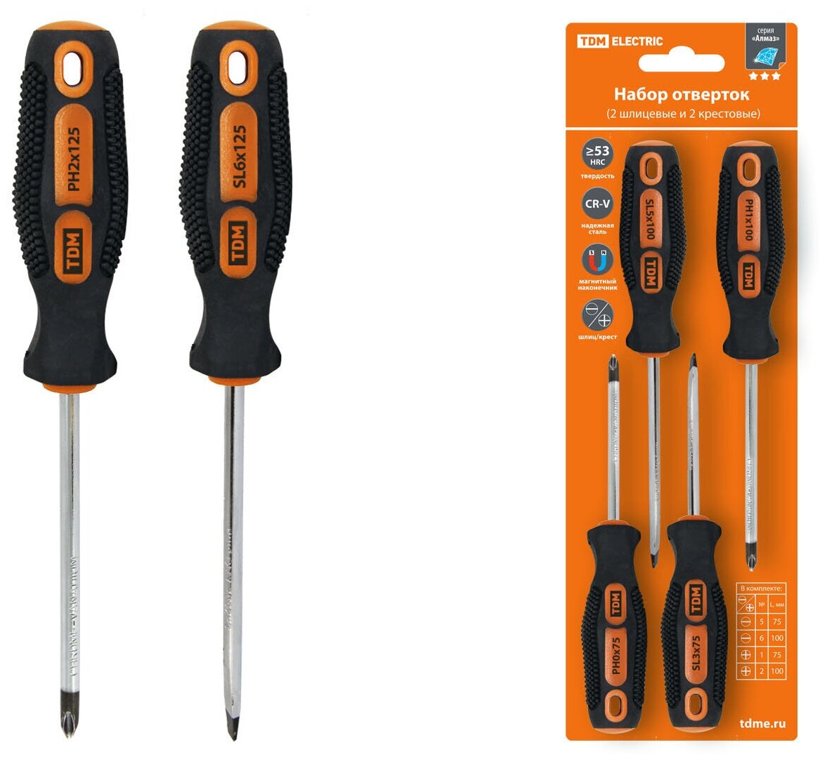Набор отверток TDM Алмаз 4 шт: SL5х75, SL6х100, PH1х75, PH2х100 (блистер), CR-V