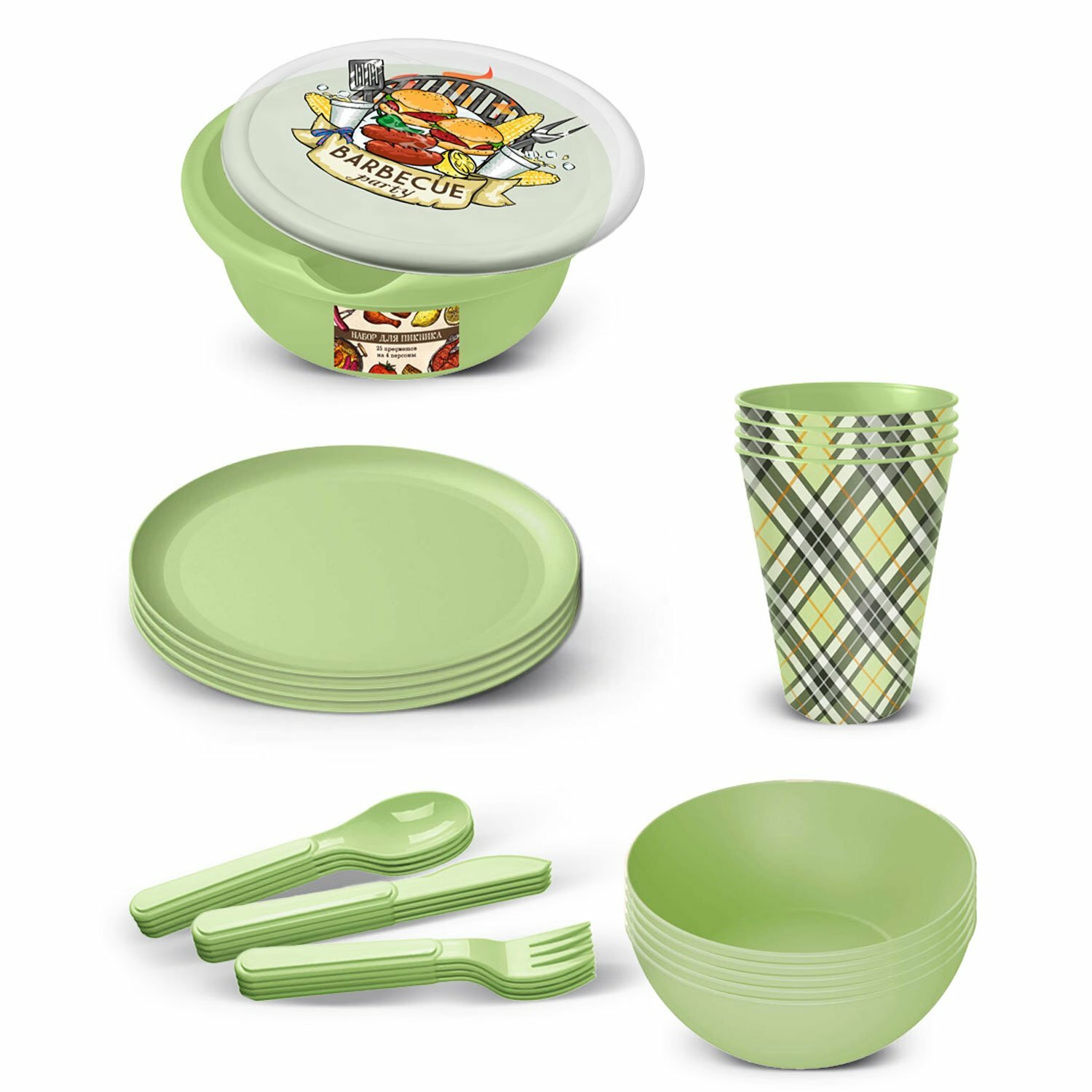 Набор для пикника с декором, 25 предметов на 4 персоны, (салатовый)