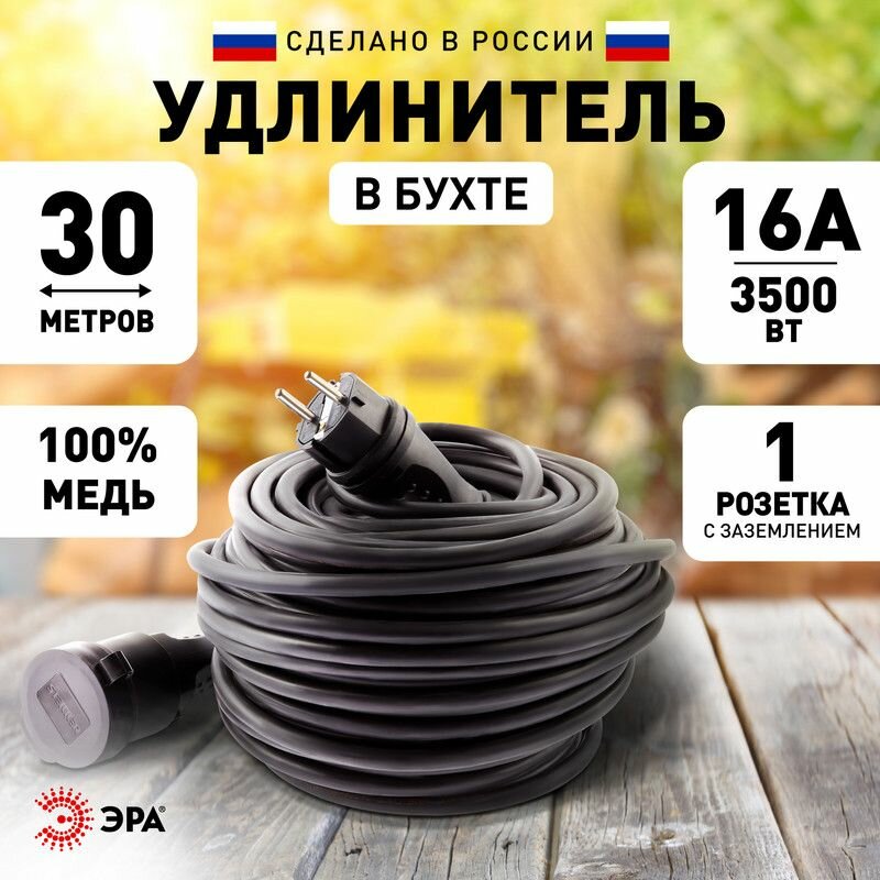 Удлинитель силовой Эра UPx-1e-3x2,5-30m-IP44(KG), розеток 1шт, 3x2.5 кв.мм, 16A, 30м, КГ, без катушки, черный [б0050864]