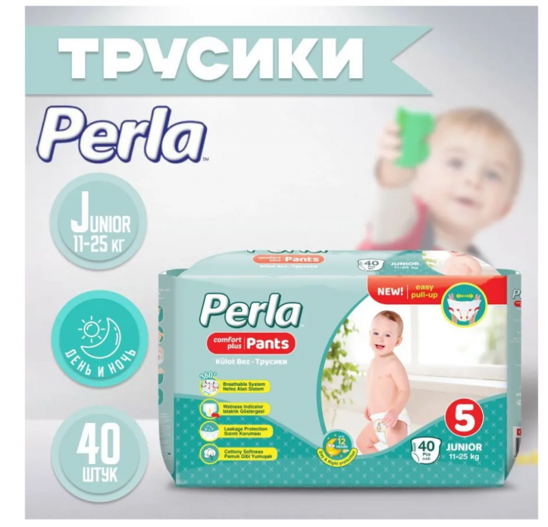 Детские подгузники-трусики Perla Pants Junior для малышей 11-25 кг, 5 размер, 40 шт памперсы-трусики для девочек и для мальчиков одноразовые интересное: