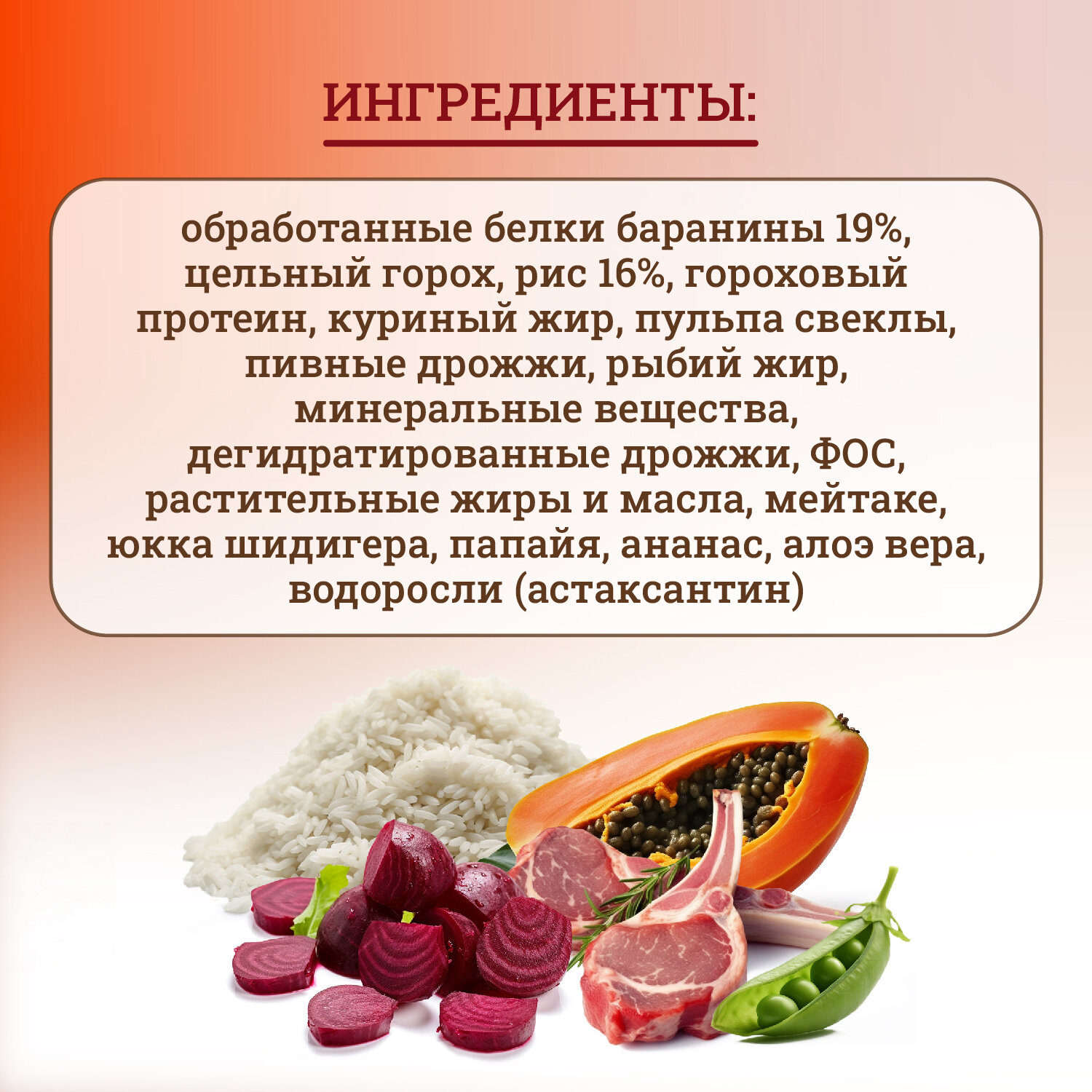 | Состав | обработанные белки баранины 19%, цельный горох, рис 16%, гороховый протеин, куриный жир, пульпа свеклы, пивные дрожжи, рыбий жир, минеральные вещества, дегидратированные дрожжи (Био МОС), ФОС, растительные жиры и масла, Мейтаке (Grifola frondosa) 0.027%, Юкка Шидигера, продукты и субпродукты свежих фруктов и овощей (Папайя (Carica papaya) 0.025%), продукты, полученные в результате переработки растений (Ананас (Ananas spp.) 0.025%), продукты, полученные в результате переработки растений (Алоэ вера (Aloe vera) 0.013%), водоросли (Haematococcus pluvialis (aстаксантин 0.005%)), богатый токоферолом экстракт натурального происхождения — 28.4 мг/кг, Гранат обыкновенный (Punica granatum) — 150 мг/кг, Женьшень (Panax ginseng) — 50 мг/кг, Розмарин лекарственный (Rosmarinus officinalis) — 0.6 мг/кг |