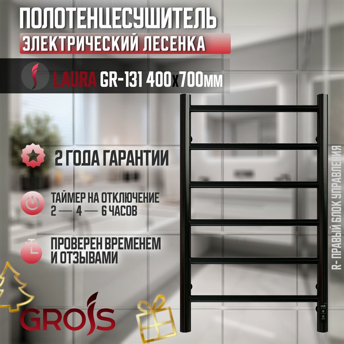 Полотенцесушитель электрический Grois Laura GR-131 400мм 700мм П6 черный матовый подключение справа форма Лесенка
