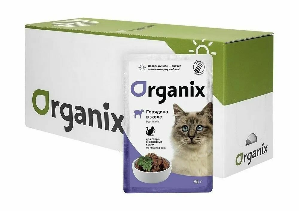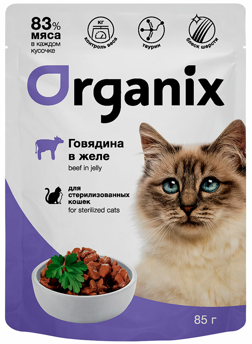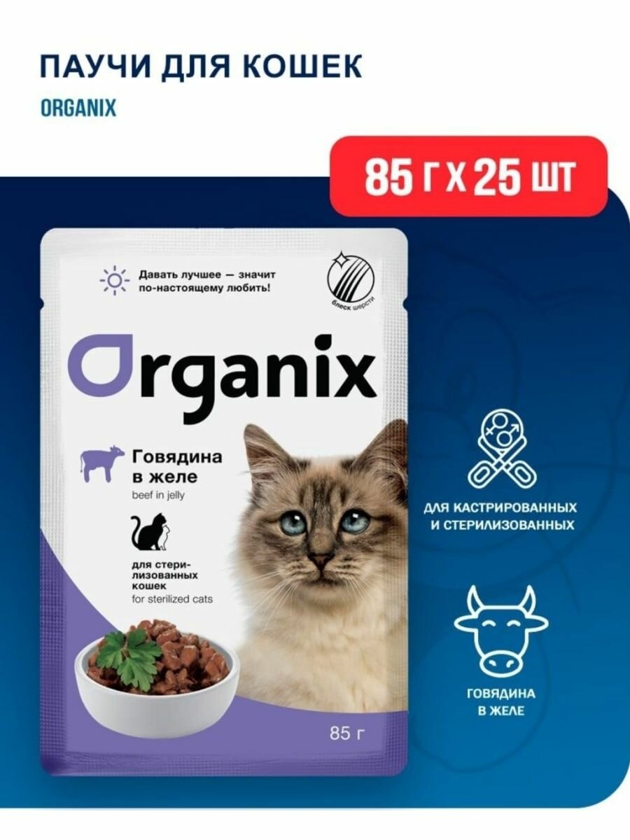 Купить ORGANIX для взрослых кастрированных котов и стерилизованных кошек с говядиной в желе (85 гр х 25 шт)