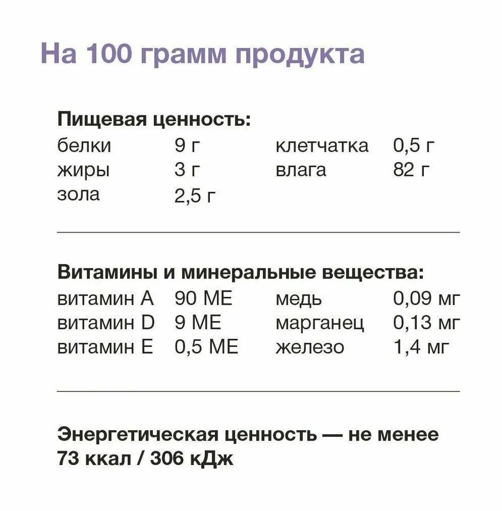 | Витамины | витамин А – 90 МЕ, витамин D – 9 МЕ, витамин Е – 0,5 МЕ |
