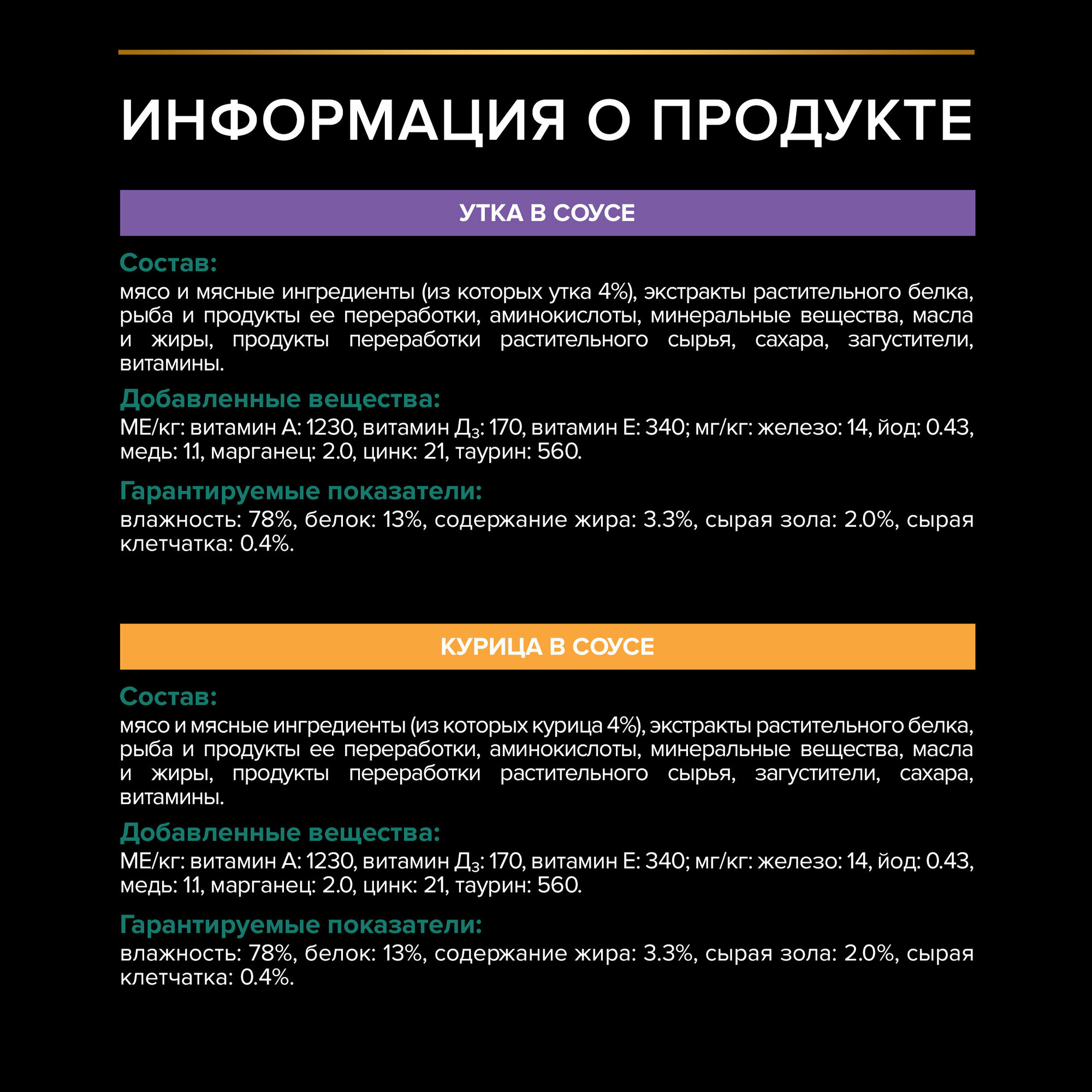 Корм консервированный полнорационный для взрослых стерилизованных кошек и кастрированных котов, нежные кусочки с уткой, в соусе; с курицей в соусе 85 г х 10 шт.