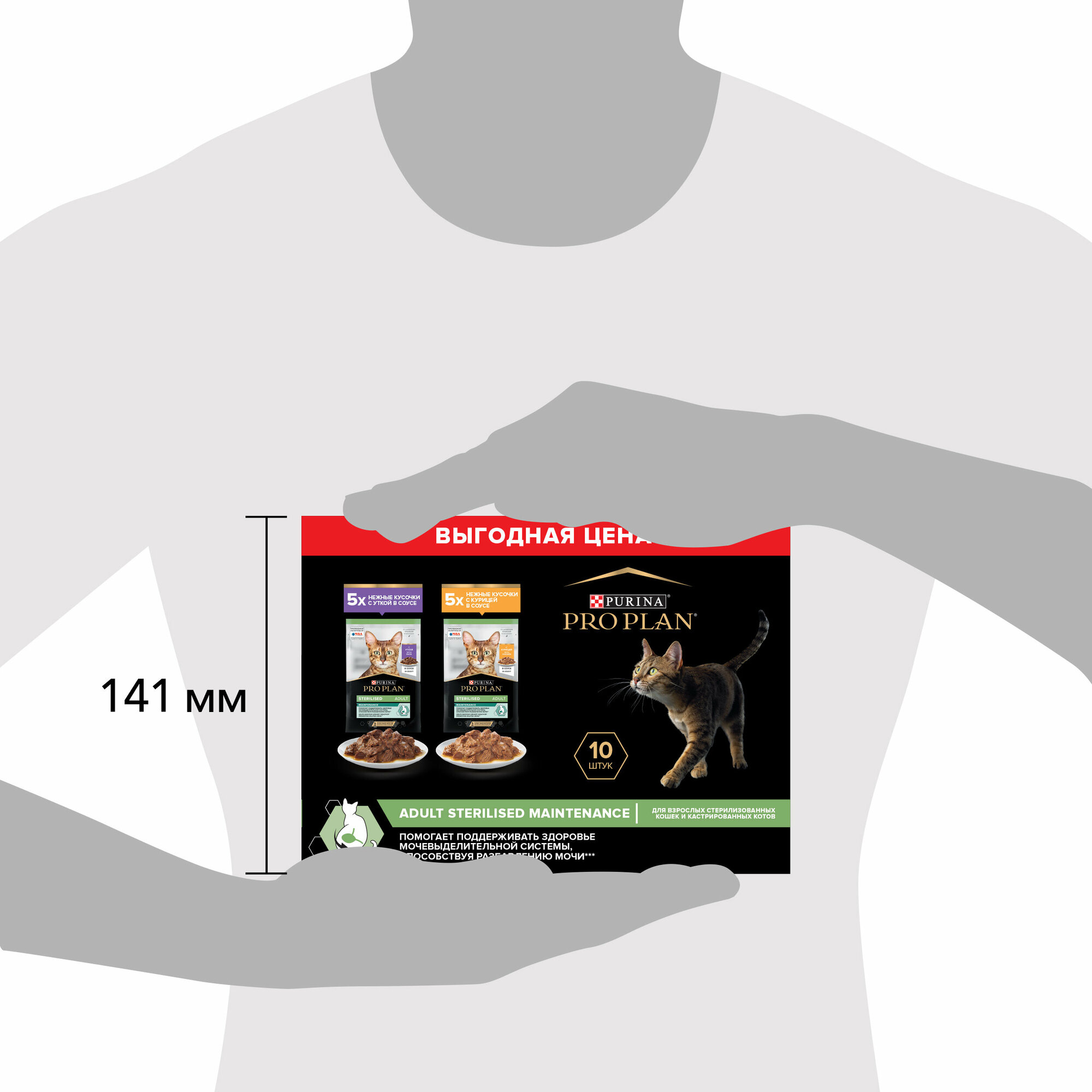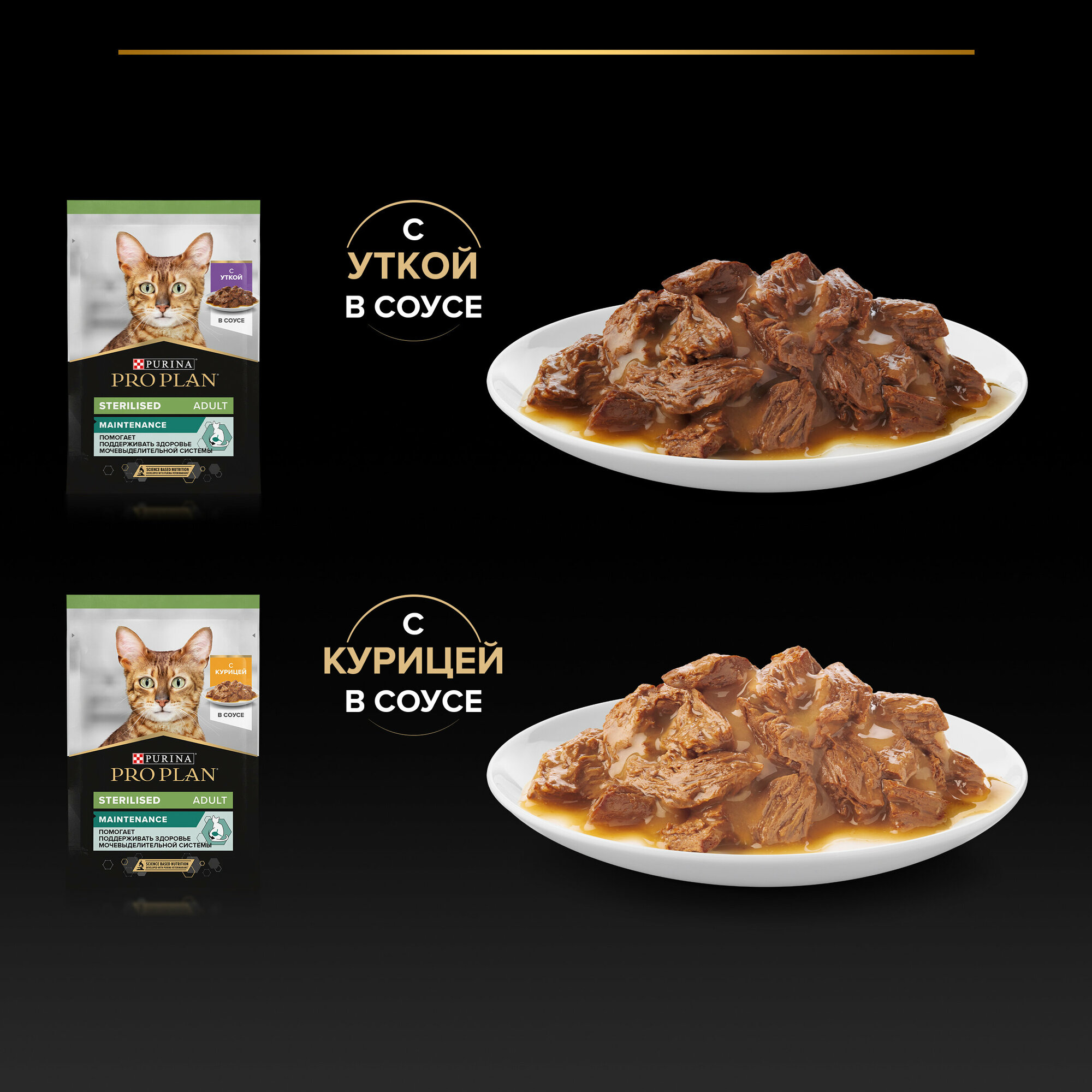 Влажный корм PRO PLAN® паучи для взрослых стерилизованных кошек, с уткой в соусе, с курицей в соусе, Sterilised MAINTENANCE, 85 г х 10 шт.