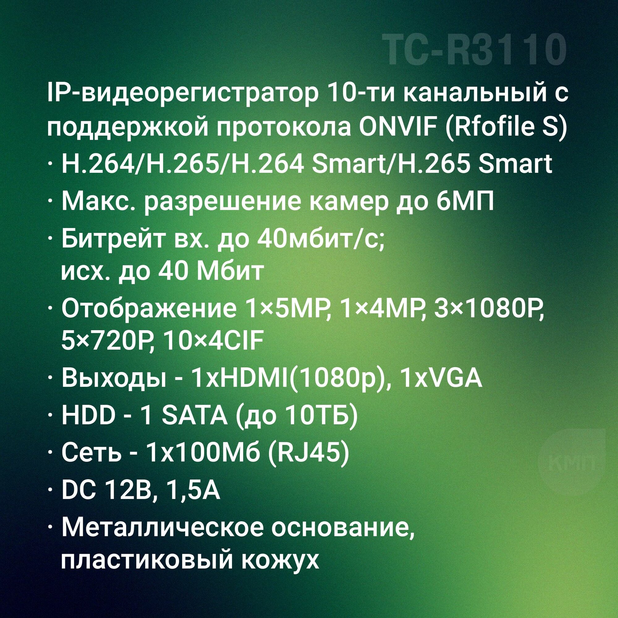 Видеорегистратор IP Tiandy TC-R3110, Spec:I/B/L/Eu,10-канальный NVR
