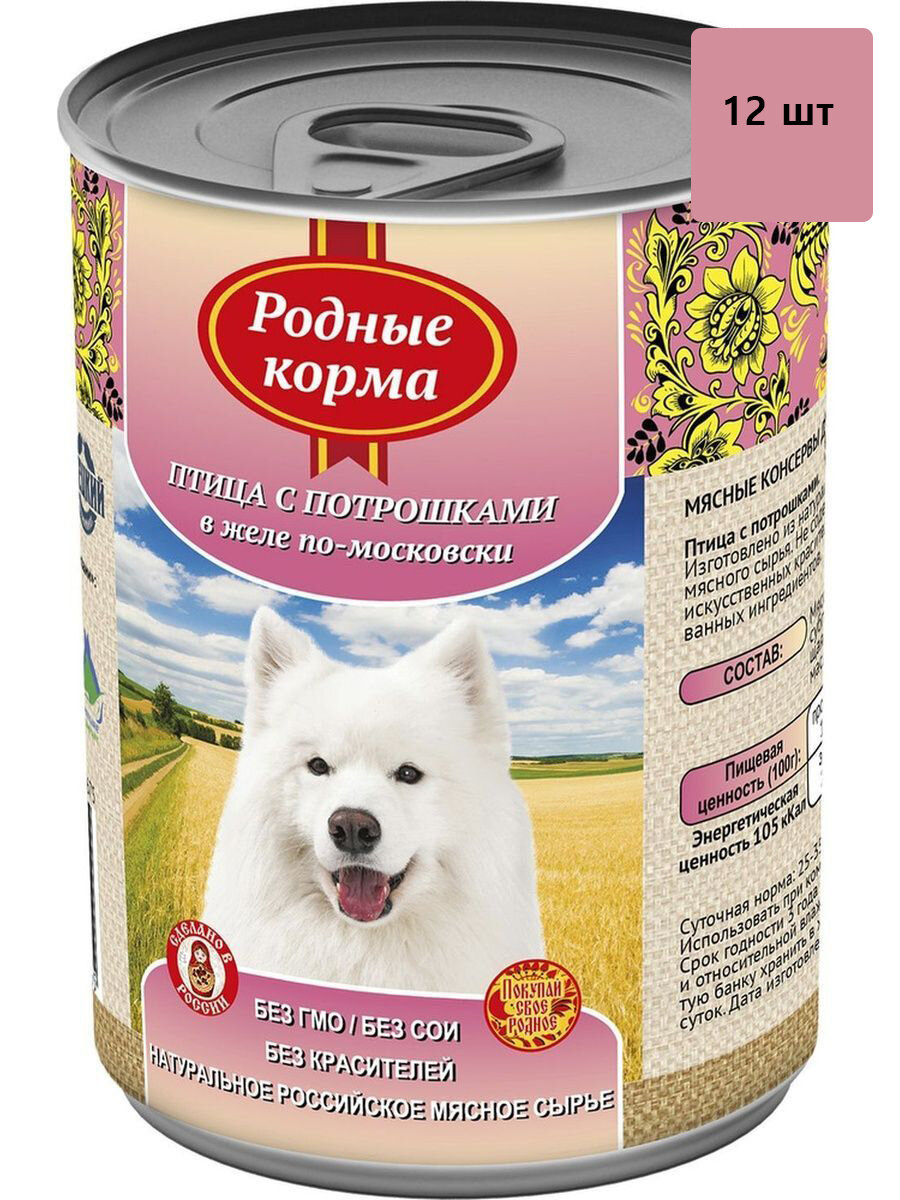 Родные корма консервы для собак Птица с Потрошками в Желе-По Московски 12х970г