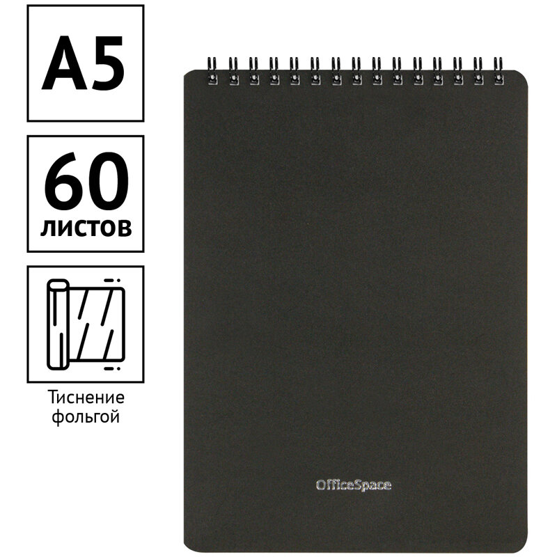 Блокнот А5 60л. на гребне OfficeSpace Base черная пластиковая обложка
