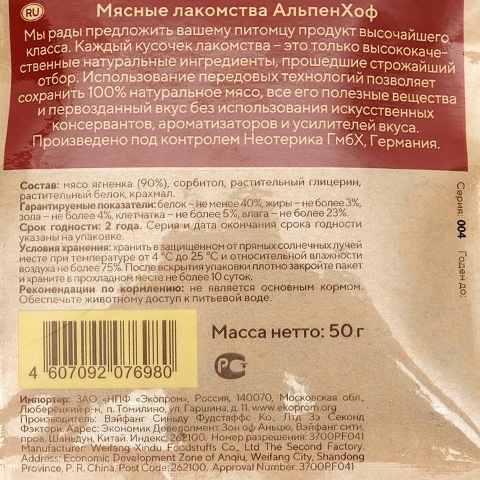 | Состав | мясо ягненка (90%), сорбитол, растительный глицерин, растительный белок, крахмал |
