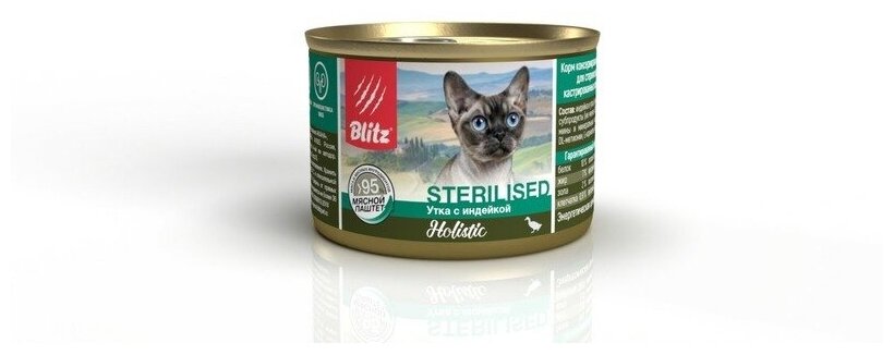 BLITZ корм консервированный полнорационный для стерилизованных кошек и кастрированных котов утка с индейкой мясной паштет, 200г