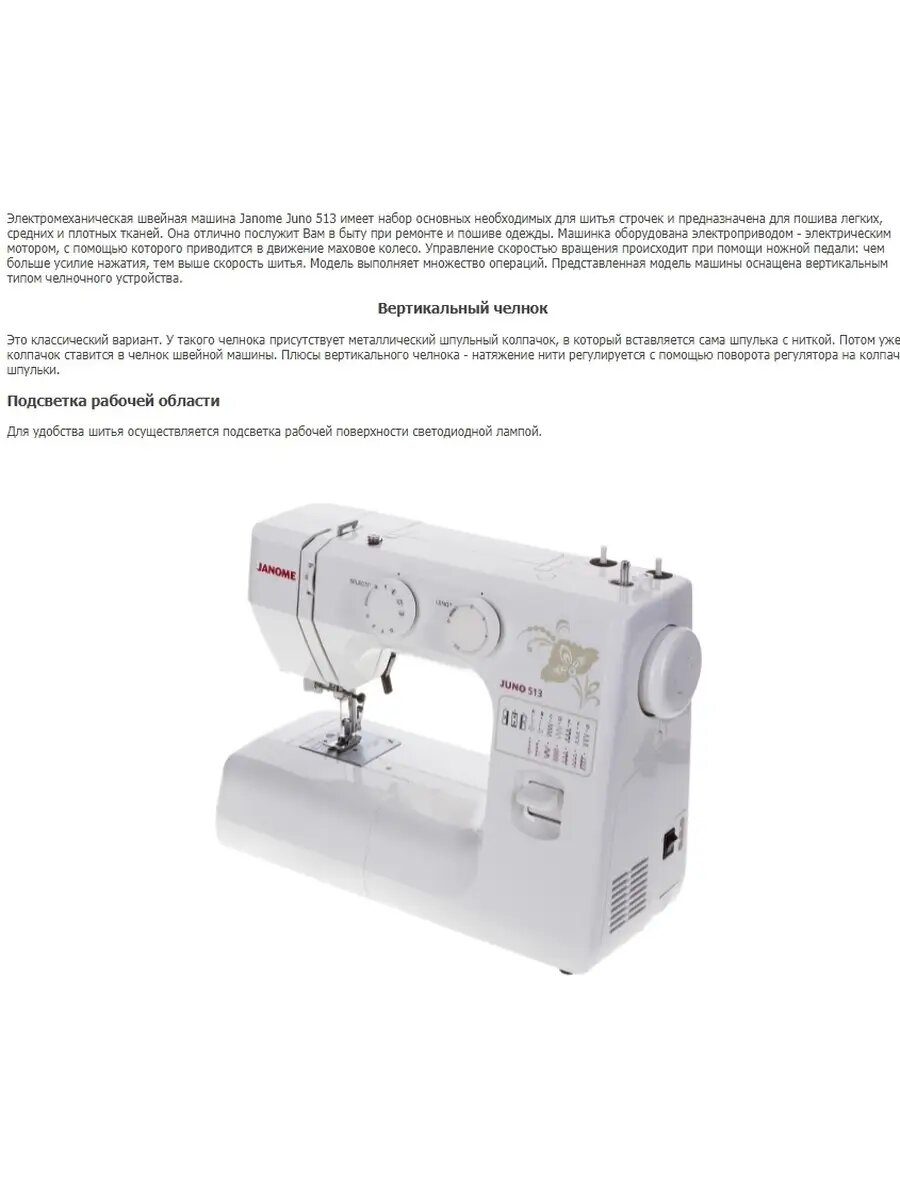 Швейная машина Janome Juno 513, 85 Вт, 15 операций, полуавтомат, белая JANOME 2543004 .