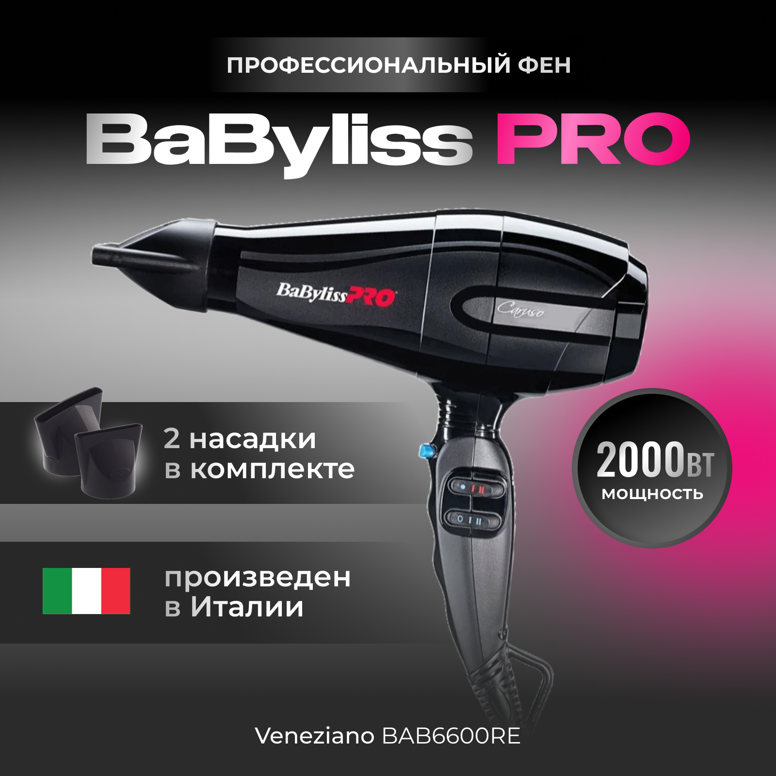 Фен BaByliss Pro Veneziano, 2000 Вт, 2 насадки, черный Bab6600re .