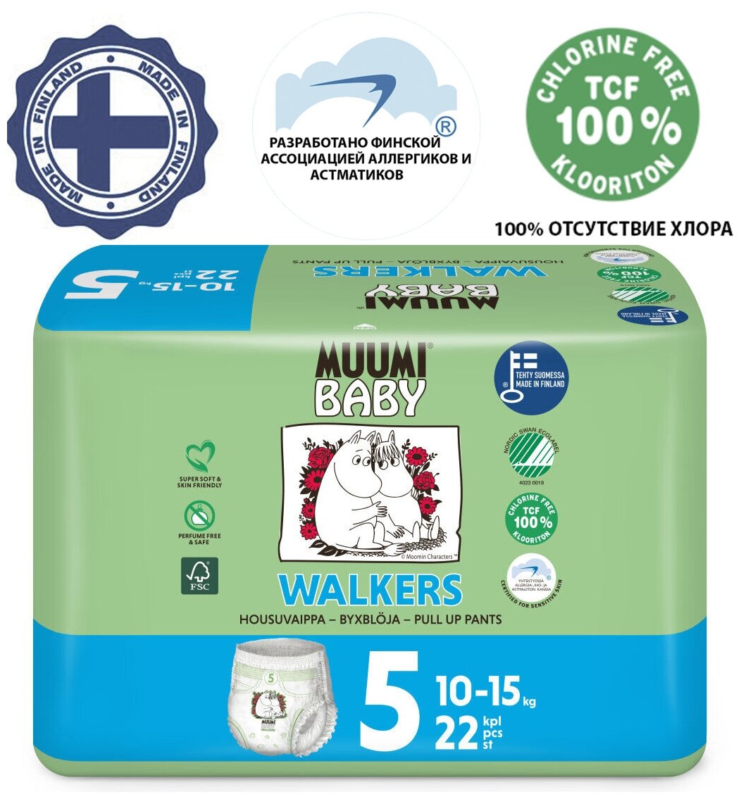 MUUMI BABY WALKERS Эко Подгузники трусики органические, натуральные, биоразлагаемые, детские №5 10-15 кг, 22 шт интересное: