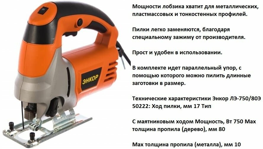 Лобзик 750Вт, ЛЭ-750/80Э, 80мм, 800-3000/мин, ход26мм, парал. упор, 2,4кг интересное:
