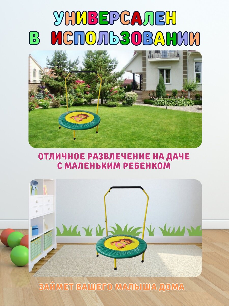 | Отзыв: | Отличный батут. Не очень прыгучий, но для маленького ребенка самое то. Прыжки получаются более контролируемые. Большой плюс наличие ручки. Ребенку в 2,5 года удобно. |