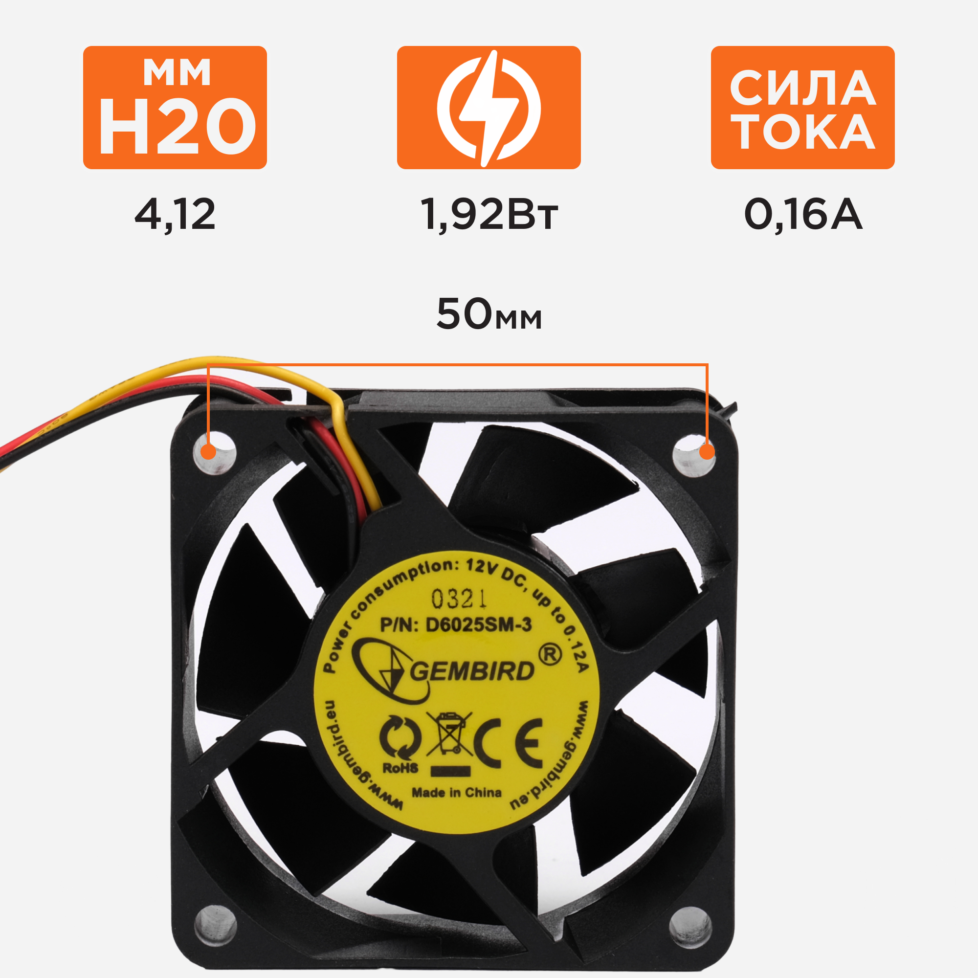 Gembird Вентилятор 60x60x25, втулка, 3pin, провод 25см D6025SM-3