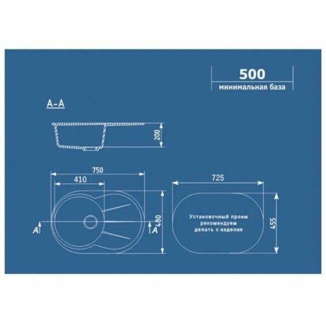 Мойка для кухни Ulgran врезная 750 х 480 мм со сливной арматурой / Раковина для кухни из искусственного камня мрамора