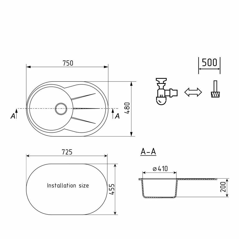 Мойка кухонная Ulgran из искусственного мрамора овальная U-503, цвет: черный, база: 72.5х45.5 см, арт. U-503-308
