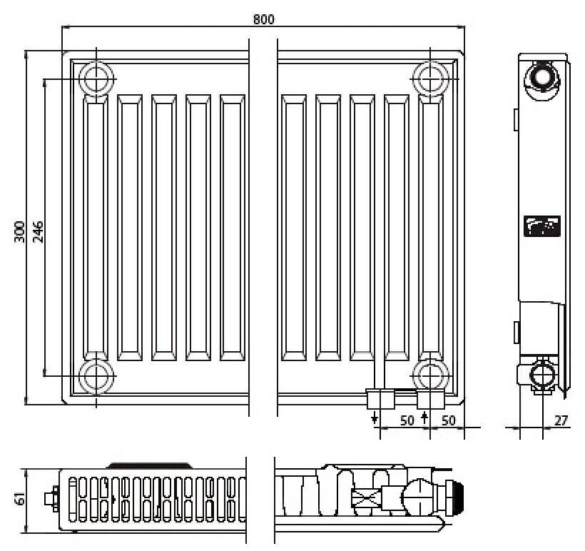 Радиатор панельный KERMI Profil-V_FTV тип 11 высота 300 ширина 800 профильный, нижнее подключение 3/4"