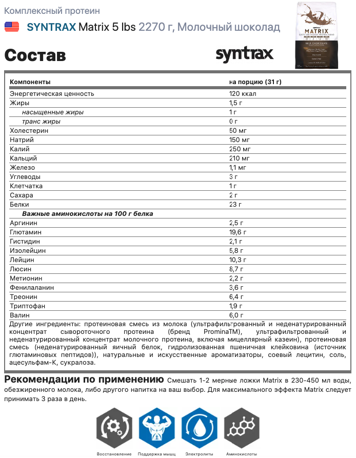 Ниже Вы можете прочитать отзывы на Комплексный протеин SYNTRAX Matrix 5 lbs 2270 г, Молочный шоколад, ознакомится с подробными характеристиками, посмотреть интересные обзоры и фотографии на Комплексный протеин SYNTRAX Matrix 5 lbs 2270 г, Молочный шоколад.
